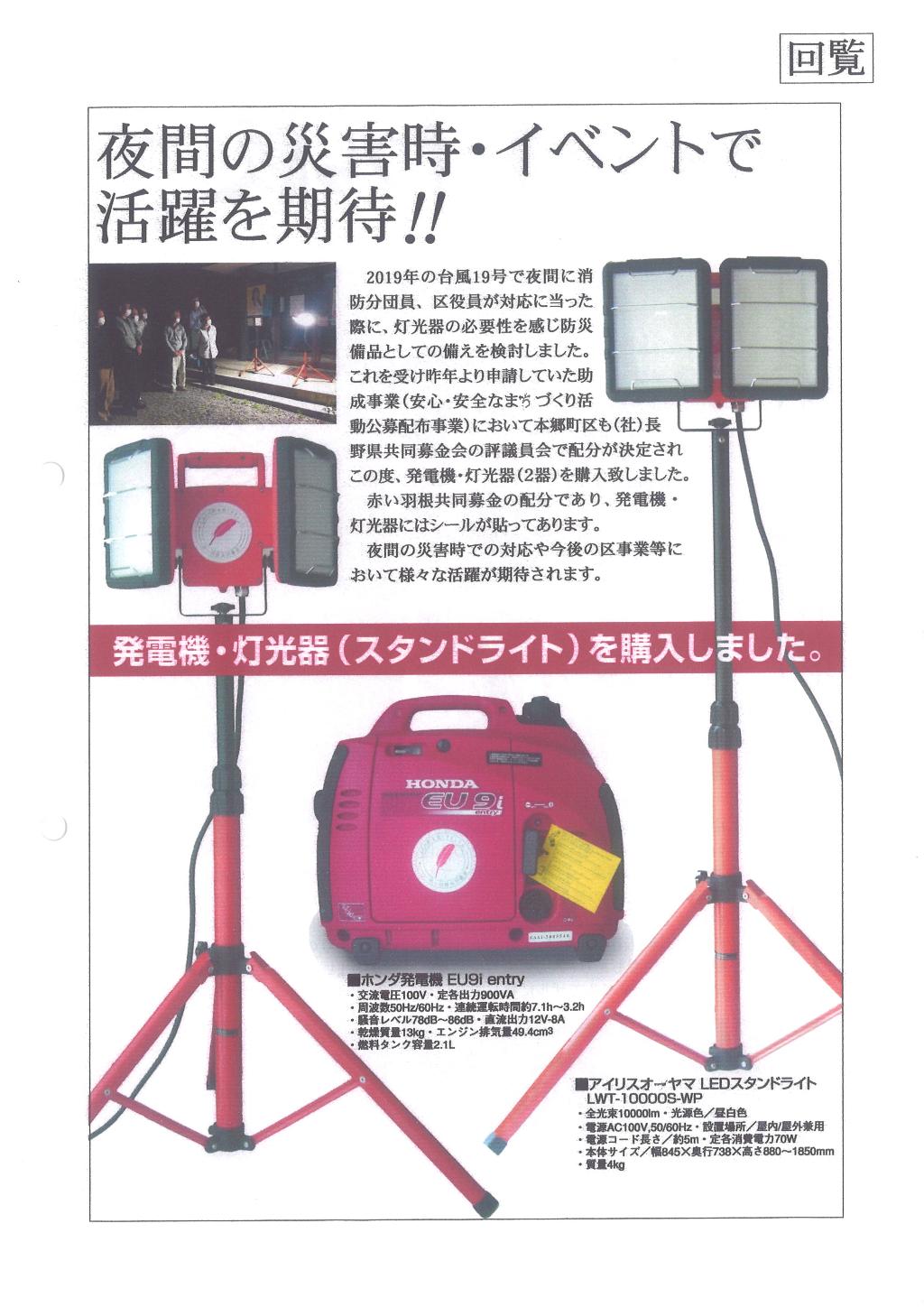 この度は、長野県共同募金会「安心·安全なまちづくり配分事業」にご選定頂きまして、発電機及びLEDライ…