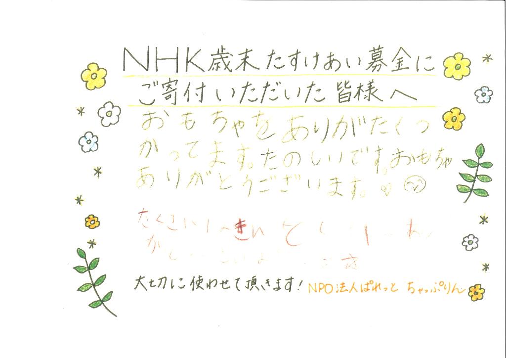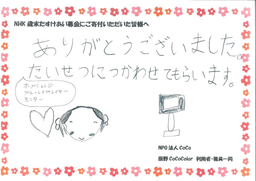 県民の皆様の暖かい善意で集められた募金が多くの市、町、村がある中、私達の地区に配分された事に心より感…