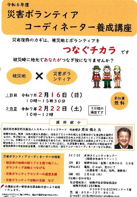 災害時に地域の被災状況の把握、災害ボランティアへのつなぎ役として活躍していただくことを目的に開催し…