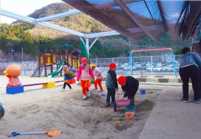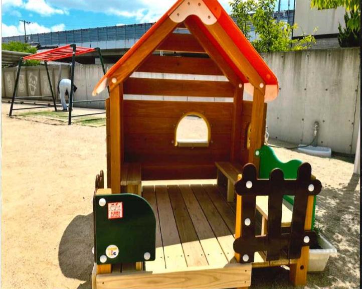 この度は共同募金の助成金をいただきまして、ありがとうございます。砂場横にハウスとテーブルベンチを設置…