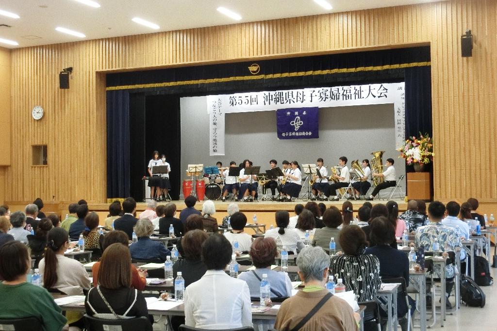 オープニングは宜野座中学校吹奏楽部の演奏で幕開け。功労者表彰および感謝状の贈呈と沖縄県内のひとり親で…
