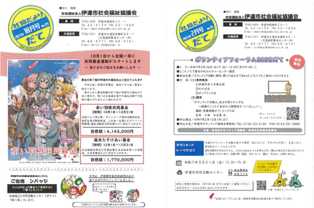 伊達市社会福祉協議会では、年3回(6・10・2月)社協だよりを発行し、市内全戸にお届けしています。各…