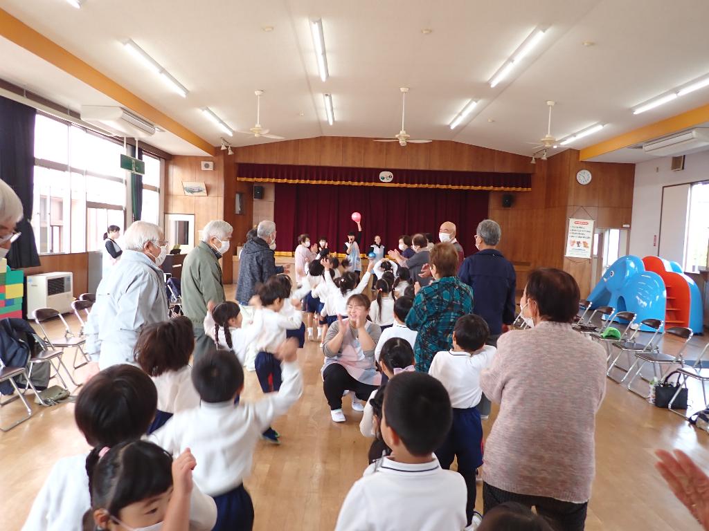園児と地域の老人クラブ会員が、レクリエーションを通して楽しく交流することができました。