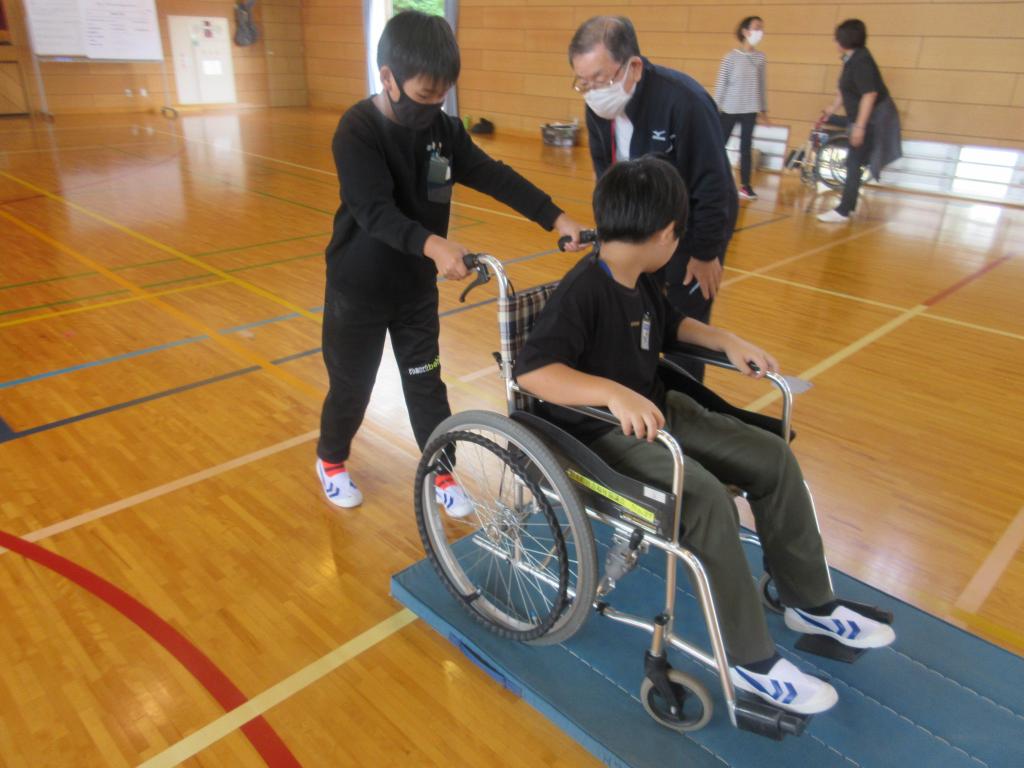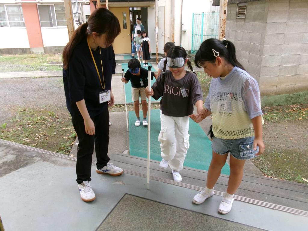 地域の学校支援ボランティアの方々の協力を得て、体験学習を充実させています。 ハンディキャップ体験で…