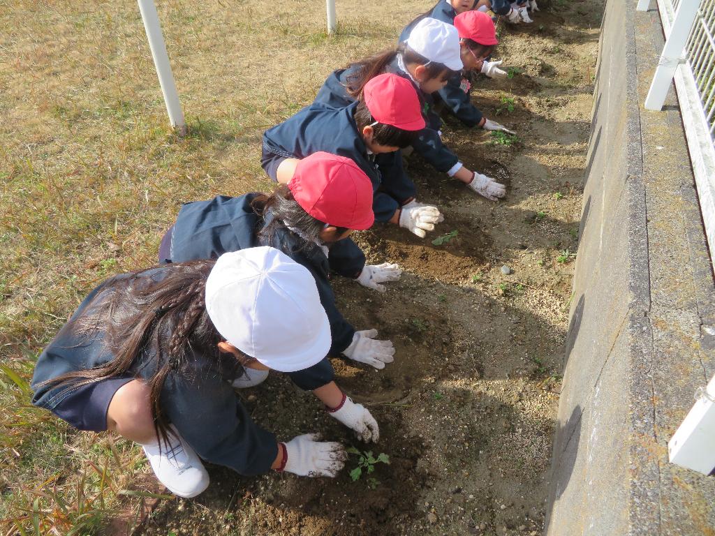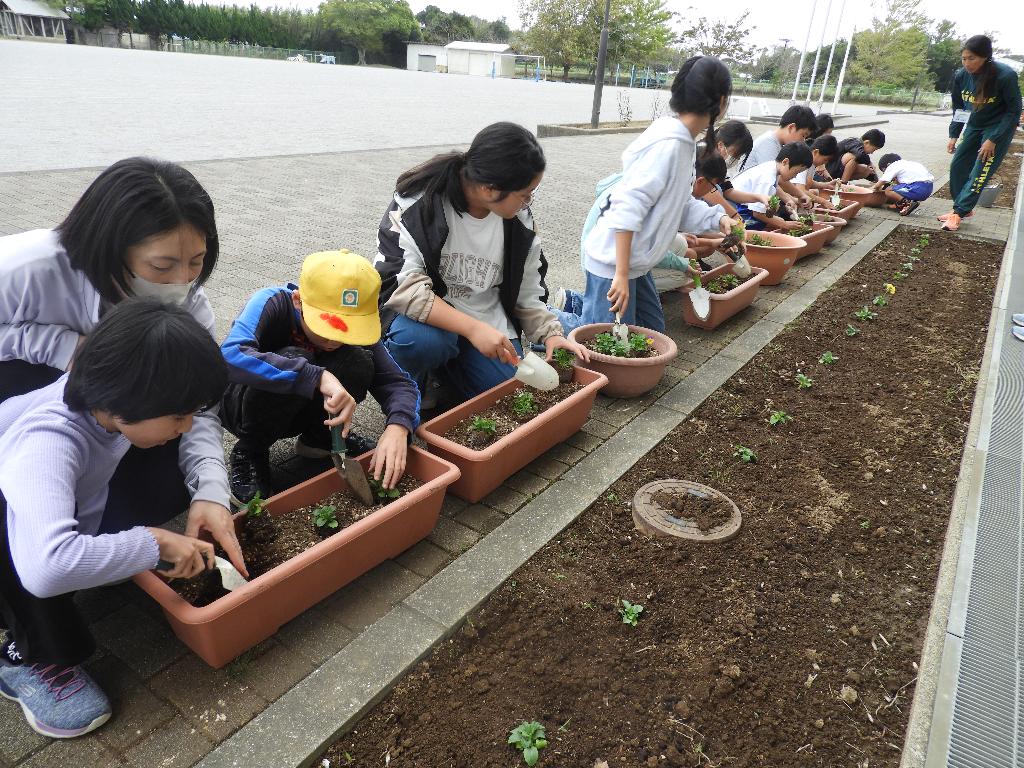 みなさんのおかげでたくさんのお花の苗を買うことができました。 児童たちは、土作りから始め、苗を植え…