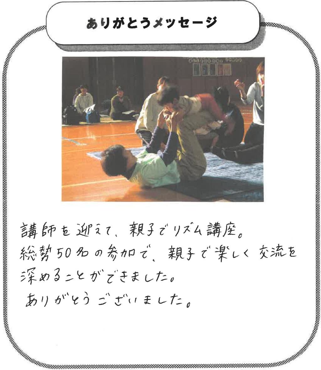 講師を迎えて親子でリズム講座。総勢50名の参加で、親子で楽しく交流を深める事ができました。 ありが…
