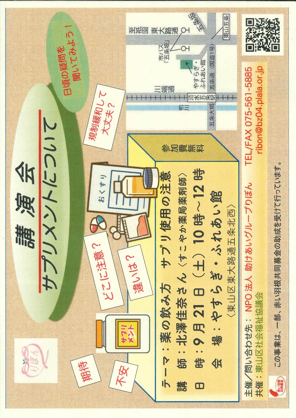 東山区社会福祉協議会の共催もいただき、開催しました。参加者は日ごろ不安に思っている薬の飲み方に関心が…