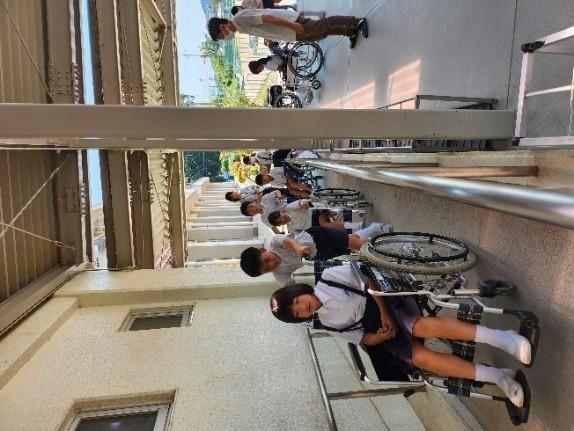 ○車いす体験をして、車いすの操作の仕方や車いすを利用されている方の気持ちを学ぶことができました。 …