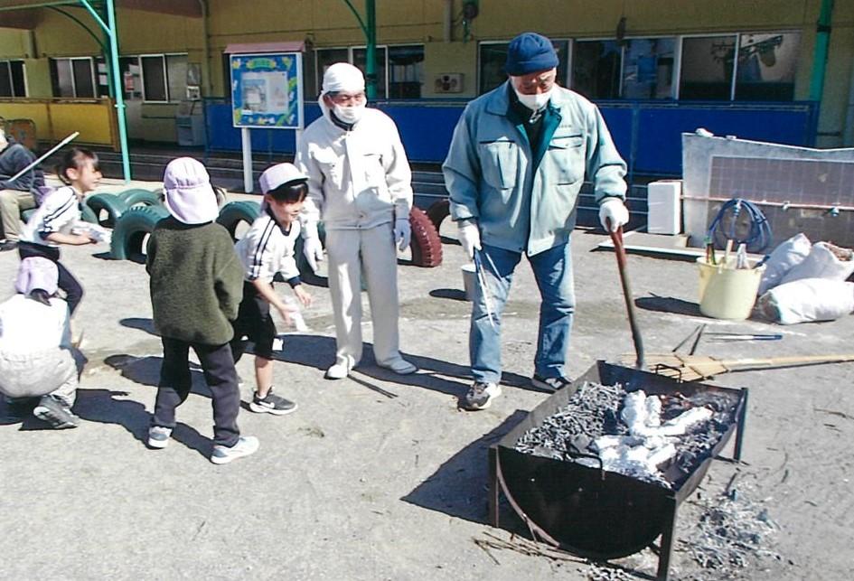 4才、5才児がおじいちゃん達が炭をおこしてくれた中にアルミホイルで包んだ芋を投げ込みました。投げるタ…