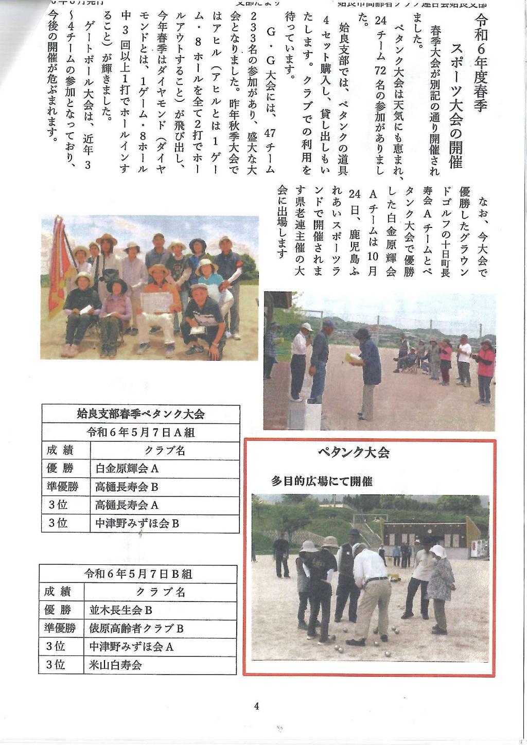 姶良:毎年春秋の2回、グランドゴルフ,ペタンク,ゲートボールの大会を行っています。天候に恵まれ、順調…