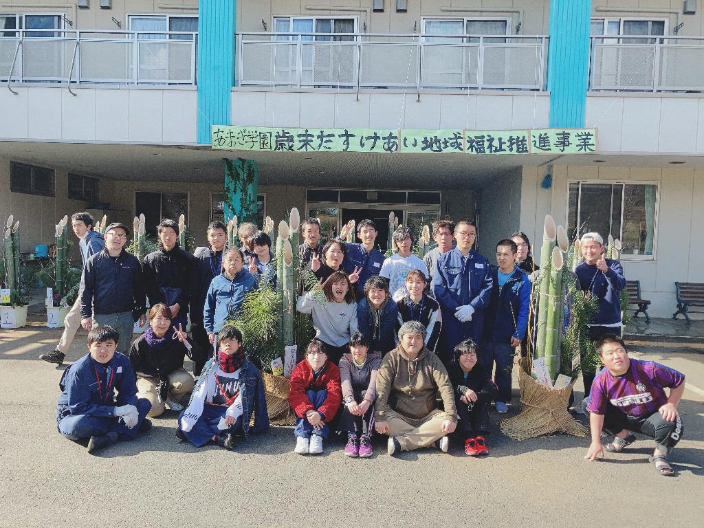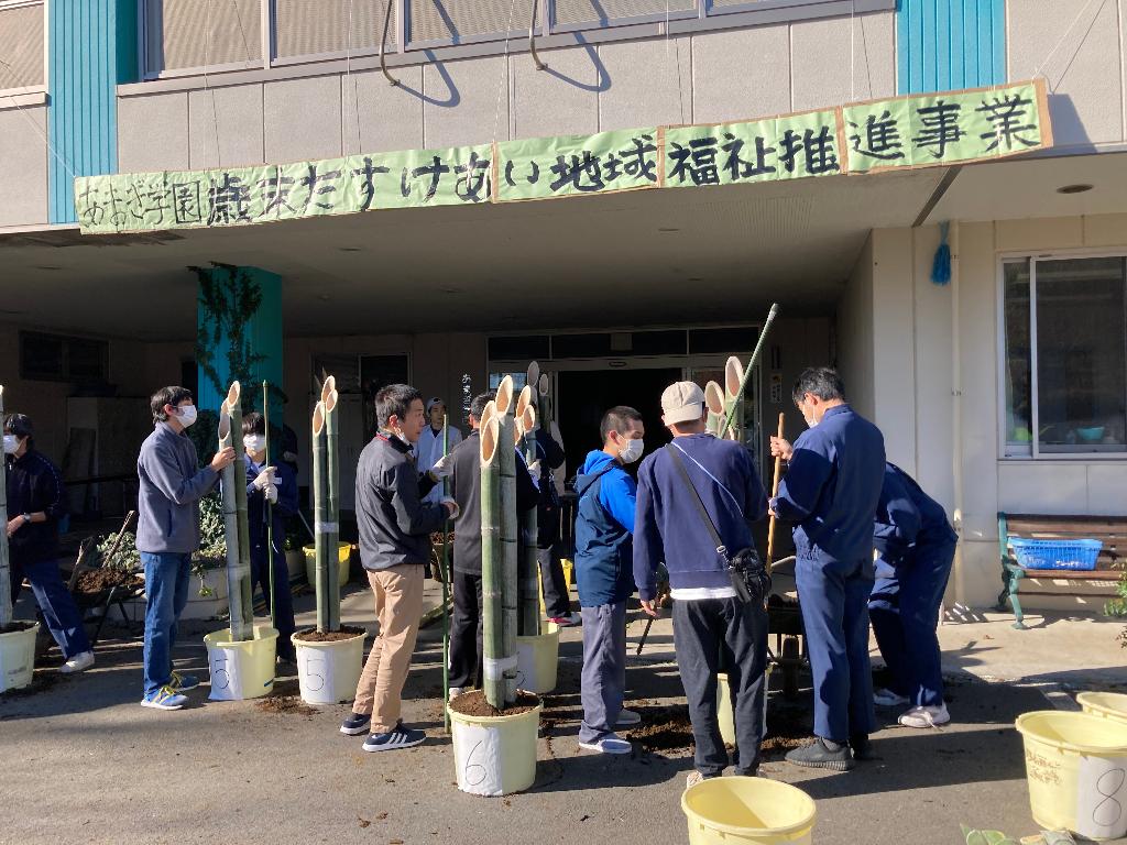 今年も門松づくりを実施することができました。歳末たすけあい助成金を交付していただきありがとうございました。今年もコロナウィルスの影響が続いており、まだまだ不安が続きます。こんな時こそみんなで願いを込めて立派な門松を作ろうと心を一つに取り組むことができました。法人各施設に願いのこもった門松を設置し、新しい年を迎える事ができます。