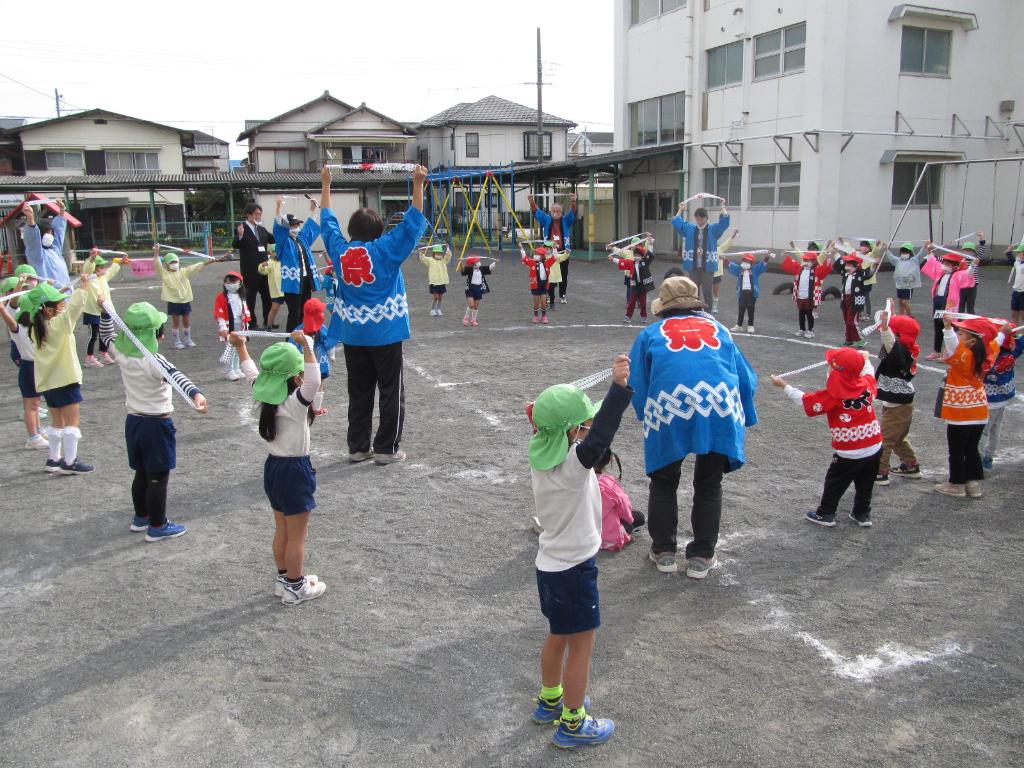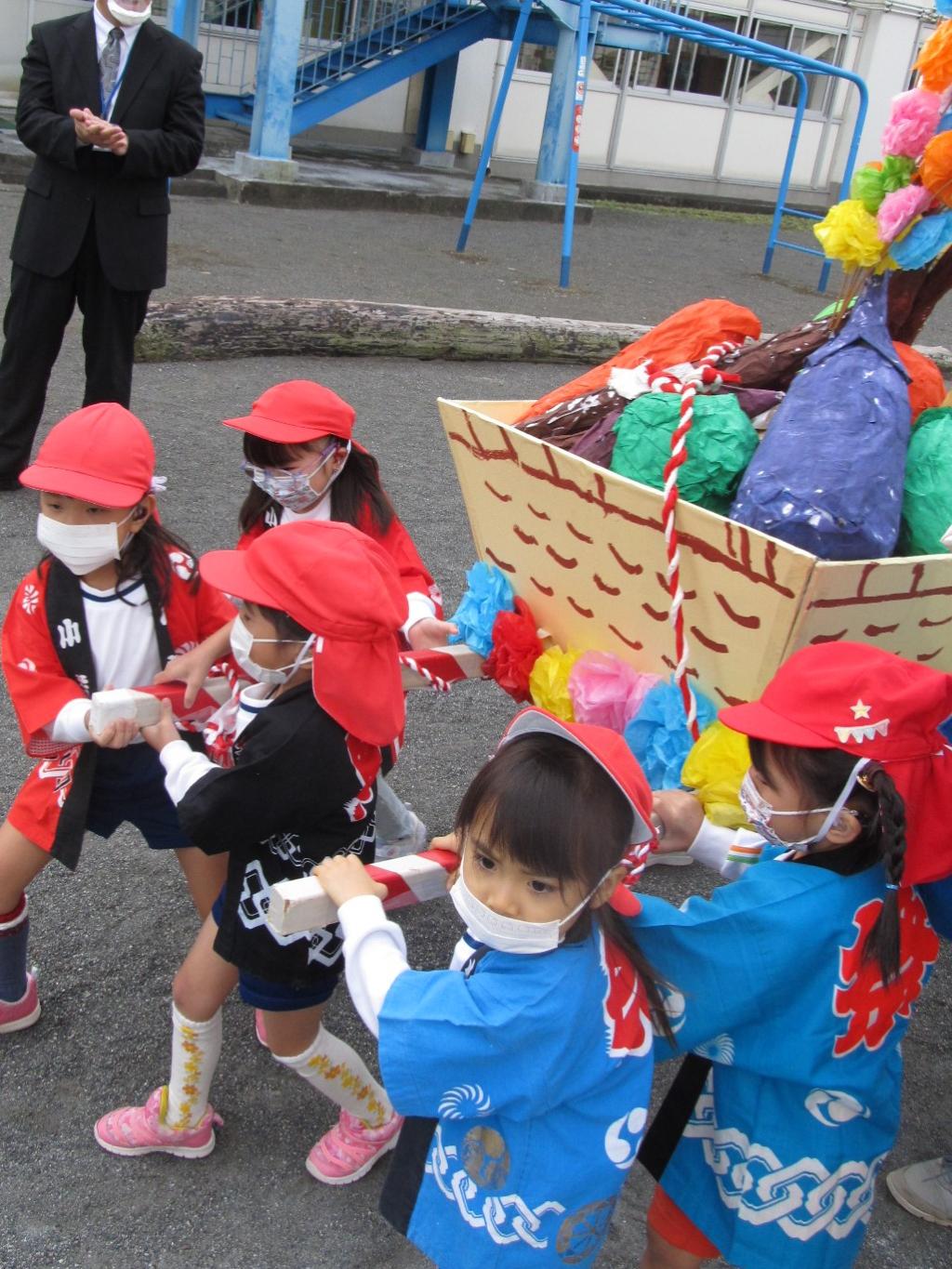 11月18日、楽しみにしていた「なかよしまつり」が開催されました。金岡保育所の友達をお迎えし、マスクをつけたり、消毒をしたり、人との間隔をあけたりしながら実施しました。幸い晴天に恵まれ、屋外で御輿を披露したり、音頭を踊ったり、お店屋さんごっこをやったりすることができました。土台を作り、色付けまで自分たちで取り組んだ手作りの御輿はどれも人気で、特に「ポケモン」のキャラクター御輿は子どもたちの注目を集めました。ありがとうございました。