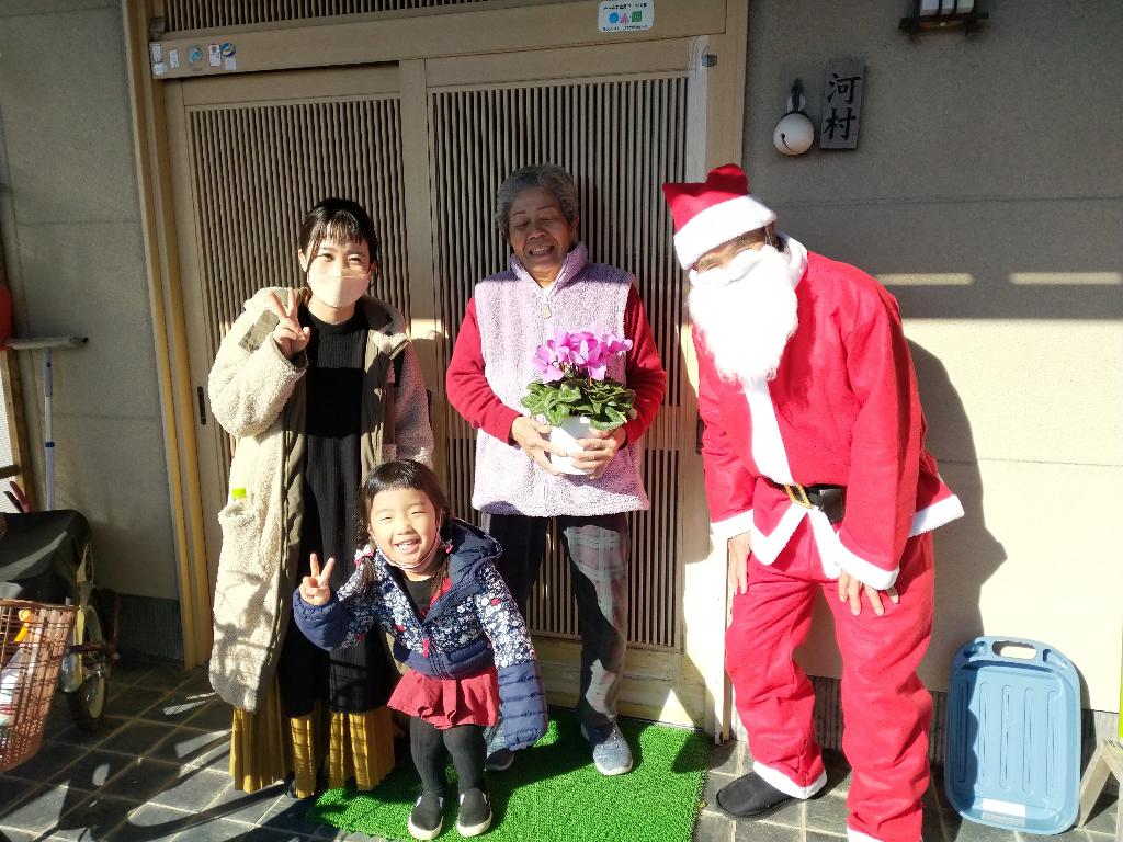 ①町内会長及び子供達にサンタクロースが同行して高齢者宅を訪問し、クリスマスプレゼントとして「生花及びクリスマスケーキ」のセットを贈呈しました。