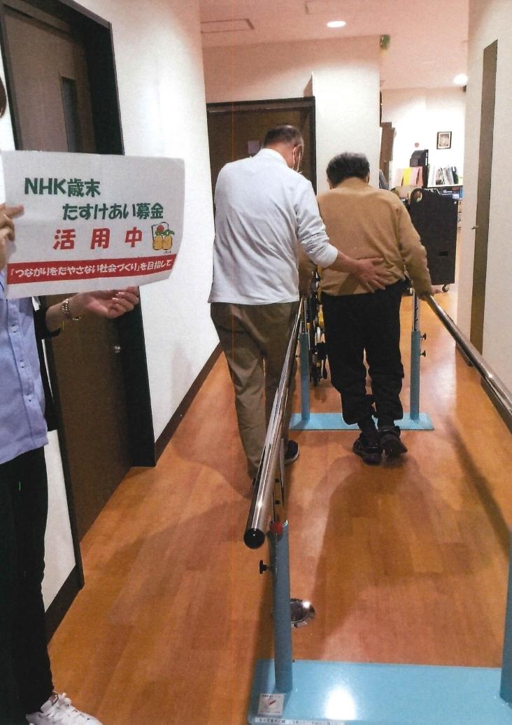 この度はNHK歳末たすけあいの助成を頂きありがとうございます。コロナ禍であり、外出や集団レクの機会が減り、活動量が低下していました。そんな中、助成金を利用し平行棒を購入することができ、ご利用者の運動する機会を増やすことができました。サイドテーブルは発熱のご利用者が発生し居室での対応を想定して購入しました。現在は特に発熱者等もおりませんが、使用したところ、高さ調整できるので姿勢も保持できます。大切に使用させていただきます。ありがとうございました。