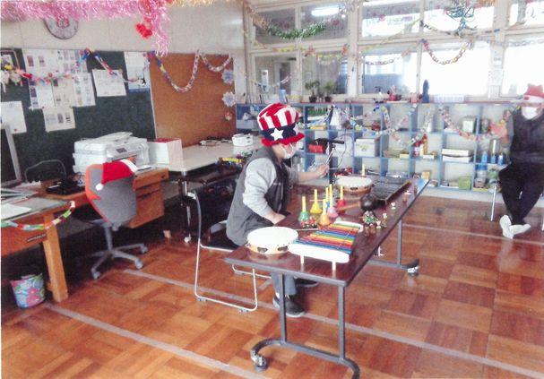令和3年度のクリスマス会を12月16日に開催しました。コロナ禍の為、今年度も利用者さんと職員のみで行い、利用者さんによる会場の飾りつけから始まり、手指消毒や換気等の感染防止策をとりながら音楽に合わせて楽器演奏をしたり、ボッチャや趣向を凝らしたゲームで楽しい時間を過ごす。