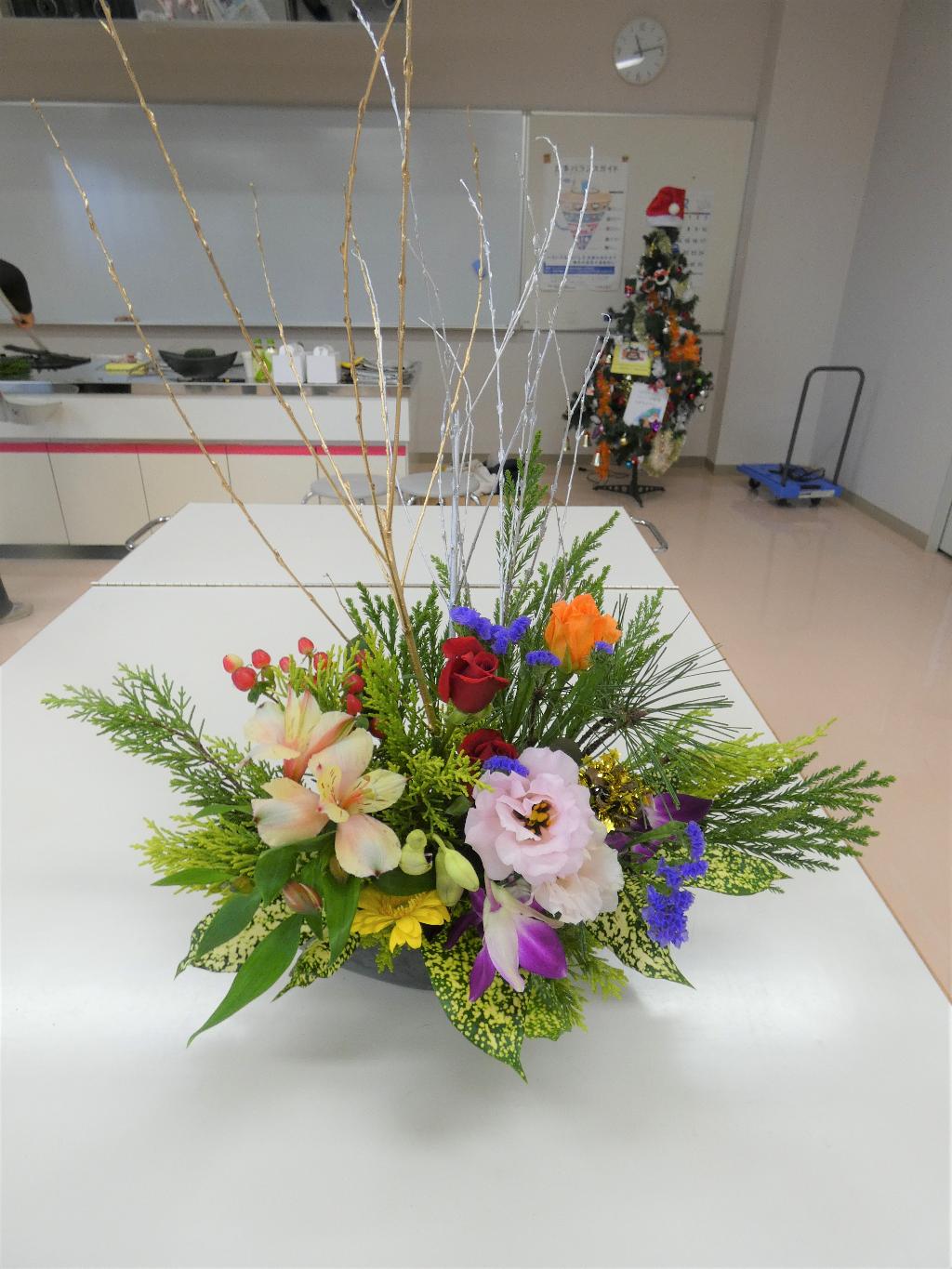 恒例のクリスマス会で、フラワーアレンジメント教室を行いました。