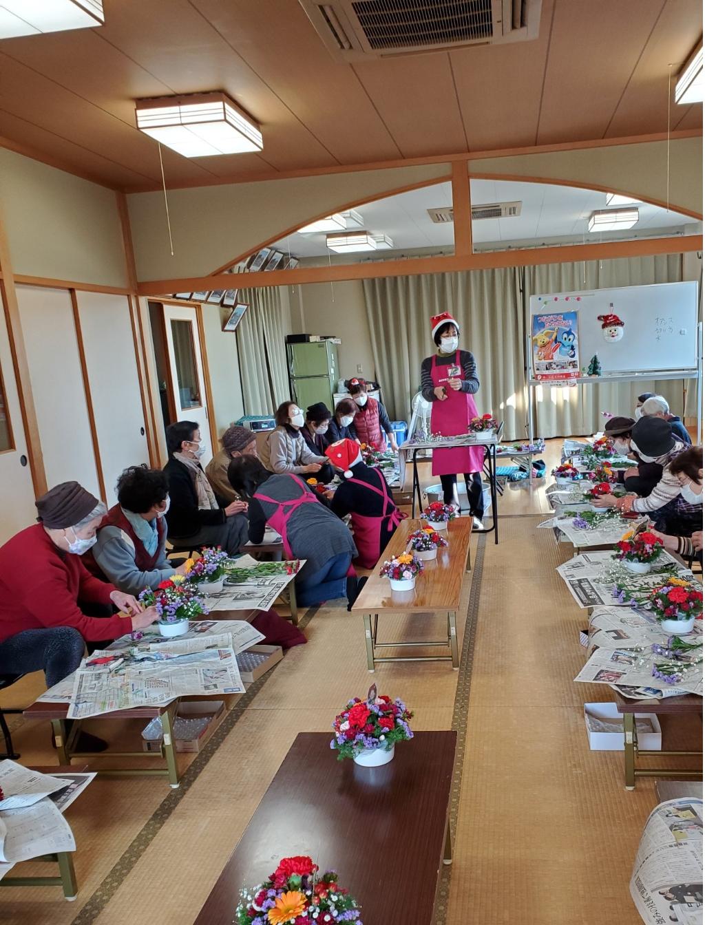 新型コロナの対策をして開催しました。昨年の「正月飾り」が好評だったため今年は生花の「クリスマスアレンジメント」を企画しました。予算的には難しいと考えましたが、赤い羽根共同募金の助成が受けられたので、花屋の交渉や前日の準備もみんなでがんばりました。