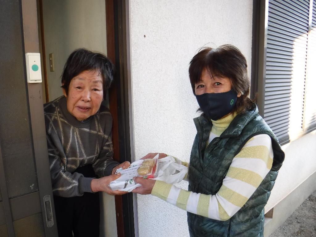 毎年、ひとり暮らし高齢者を対象に、外出の機会と交流を目的に餅つき交流会を開催。昨年度に引き続き、新型コロナウイルスの影響により内容を変更し、民生委員が見守りを兼ね赤飯と温泉饅頭を配布した。