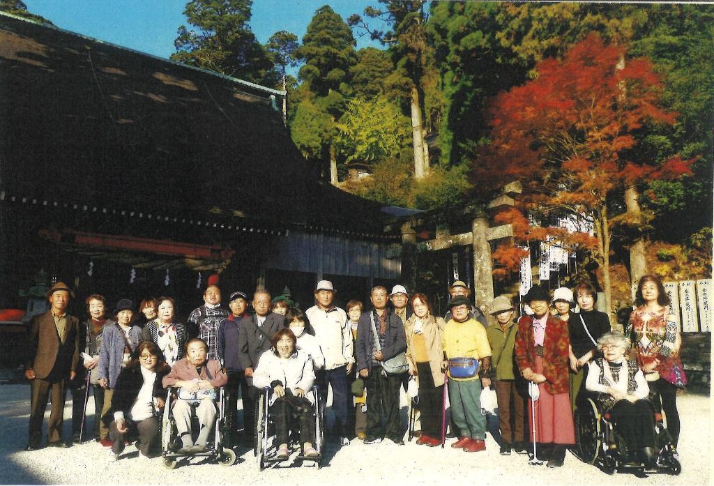 車イスの障害者の参加は年々増加し、今回は各校区の地域の方から8名の参加があり、それぞれサポートしていただきました。社会にはいろいろな障害者がいますが、サポートする側も様々です。例えば車イスを押すのが初めての方は正直怖いと思いますが、大事なのはコミュニケーションです。伝え合う事で帰る頃には上手になられ、また聴覚障害者の方とは一緒にバスに乗ったり、食事をしたり、その場の同じ空気を共有することで皆が笑顔になり、交流ができるようになりました。このバス旅行をとおして障害を理解してもらい、地域の方と交流を持つことができました。共同募金を有効に使わせていただき、いつも感謝しております。