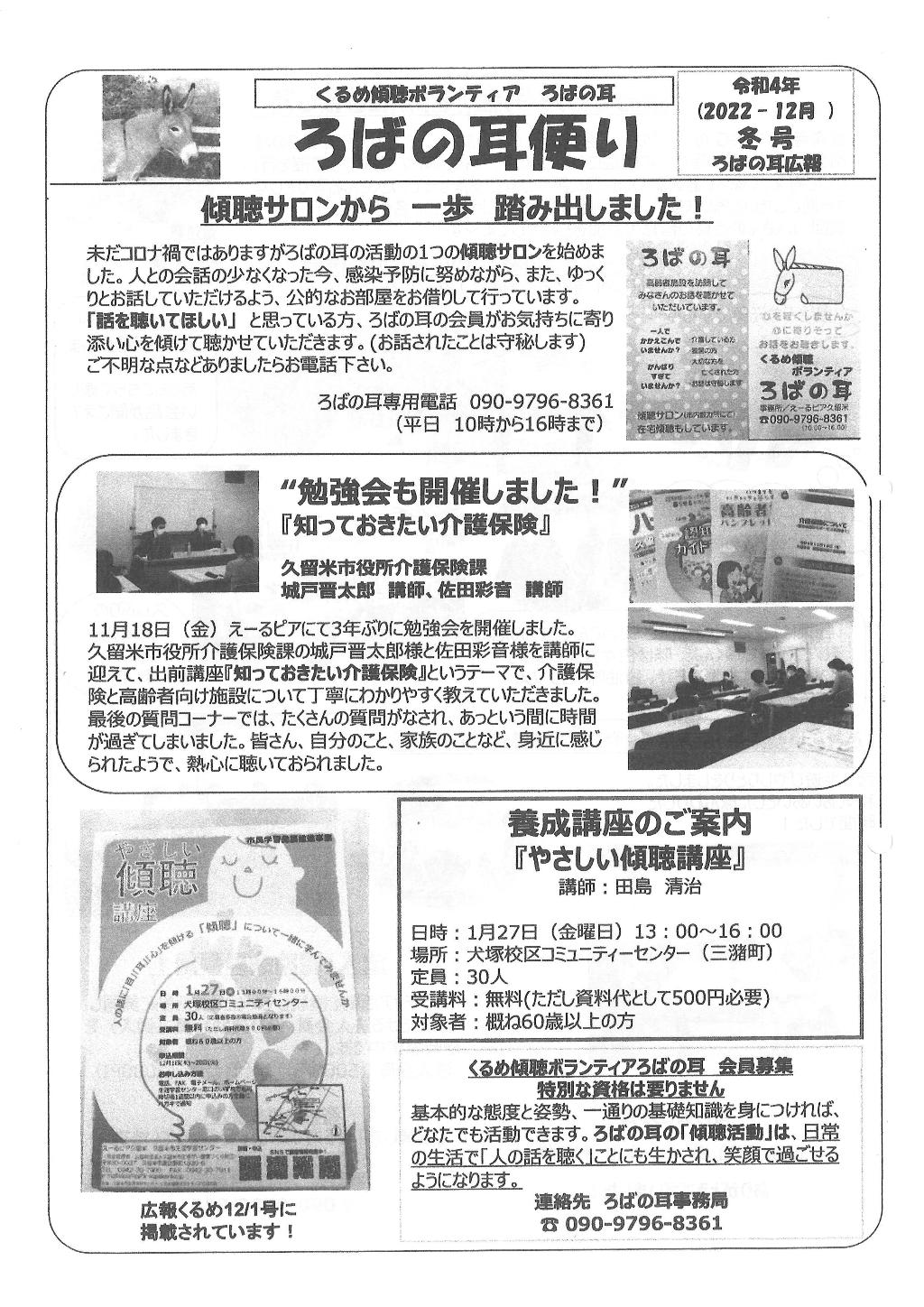 | 団体名 | くるめ傾聴ボランティアろばの耳 |