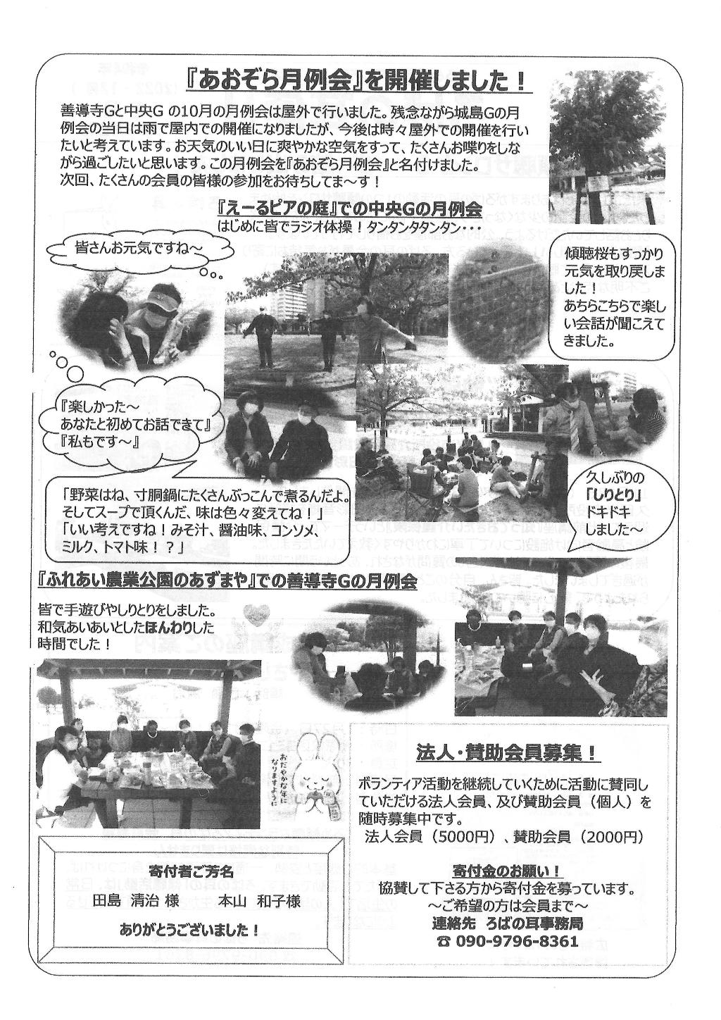 2022年度もコロナ感染拡大の為、傾聴活動ができませんでした。コロナ状況をみながら役員会・例会を開き、「ろばの耳便り2022年度冬号」を発行しました。助成金は、会員間、役員間の連絡、外部からの問合せ、在宅個人傾聴利用者への連絡等の電話代、又、欠席者への月例会のプリント「ろばの耳郵便り」等送付、関係各所への郵送代などとして使わせていただきました。今年は大分コロナも収束したみたいなので、活動が早く再開できる事を願っております。