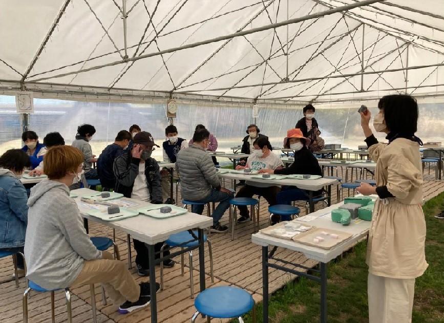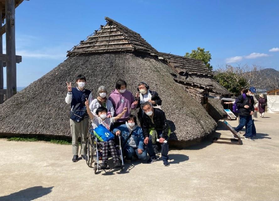 令和5年3月15日(水)に吉野ケ里公園に見学に行きました。ふれんずの利用者さんからの感想を、以下の通りまとめました。「久しぶりの外出でとても楽しかったです。」「以前に行ったことがありましたがすごく変わっていたのでびっくりしました。」「天気がよくいろんなものを見学出来てよかったです。勾玉作りは仕上げに水を使って磨いたらつるつるになり、とてもきれいになったので、びっくりしました。」「大きなバスでみんなと行けたのがよかった。」「磨くのは大変だったけど面白かった。」「勾玉がきれいにできてうれしかった。」このように、赤い羽根共同募金の助成により全員が体験学習や見学を楽しむことが出来ました。ありがとうございました。