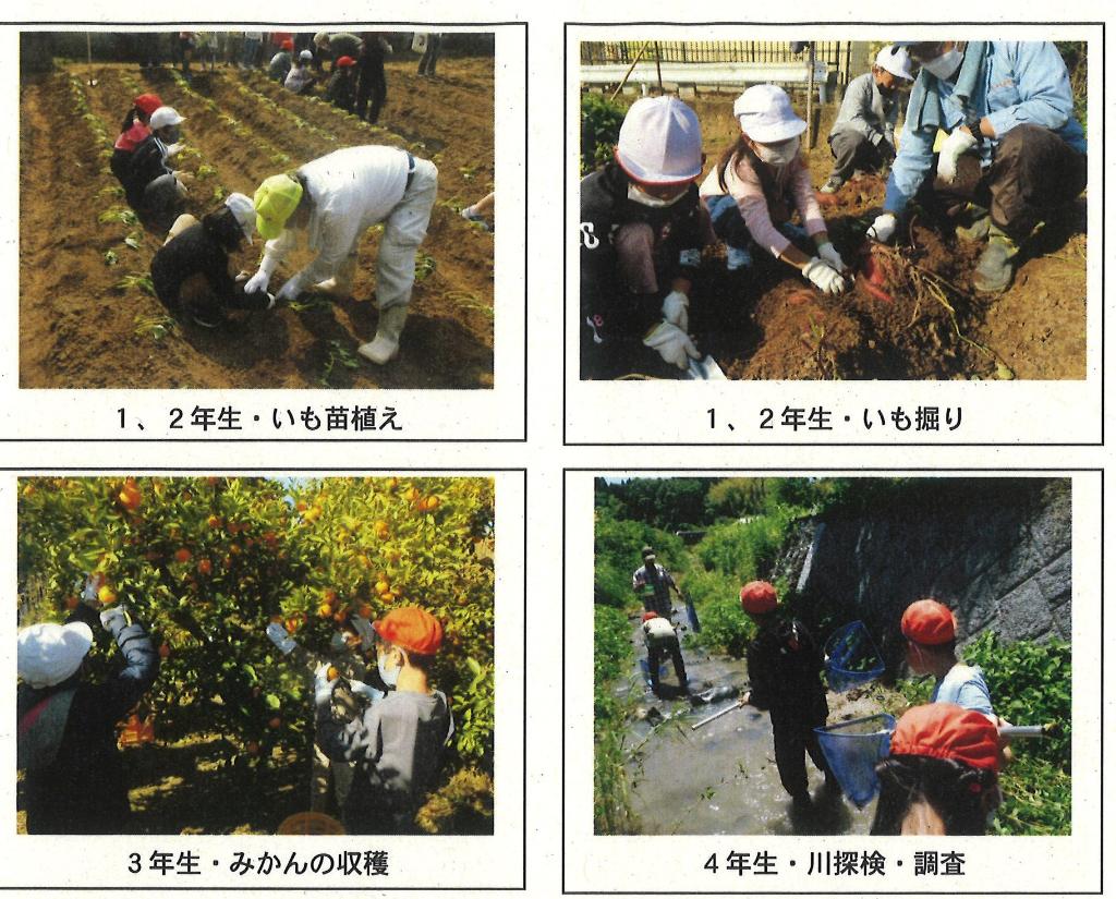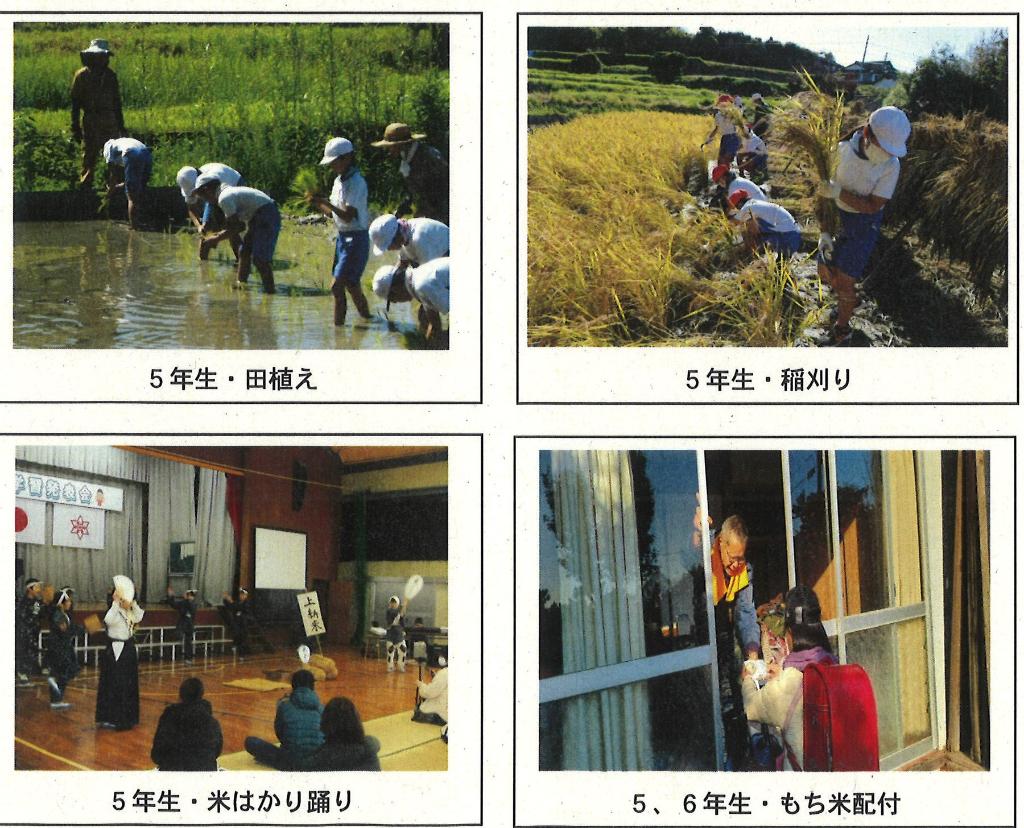 1.2年生は地域の方の畑で芋苗植え、草取り、芋ほりを行い、収穫の楽しみとともに、地域の方々への感謝の気持ちも芽生え、貴重な体験をしました。3年生は地域の方のみかん山でみかんの取り方、選び方を教わりながらみかん狩りを行い、4年生は地域の方々と川探検に行き、川の生き物、川の環境について調べました。その結果、川の環境を守ることの大切さを学び自分たちのゴミ拾いなどの環境保護の活動にむすびつけました。5年生は地域の方の田んぼで田植え、稲刈りを体験させていただき、収穫したもち米を地域の一人暮らし高齢者に配りました。6年生は対外的に「米はかり踊り」を披露することが出来、さらには5年生に引き継ぐことができ喜んでいました。このように、玉川の豊かな自然環境を生かした活動を充実して行うことが出来るのも、赤い羽根共同募金の助成事業のおかげです。本当にありがとうございました。