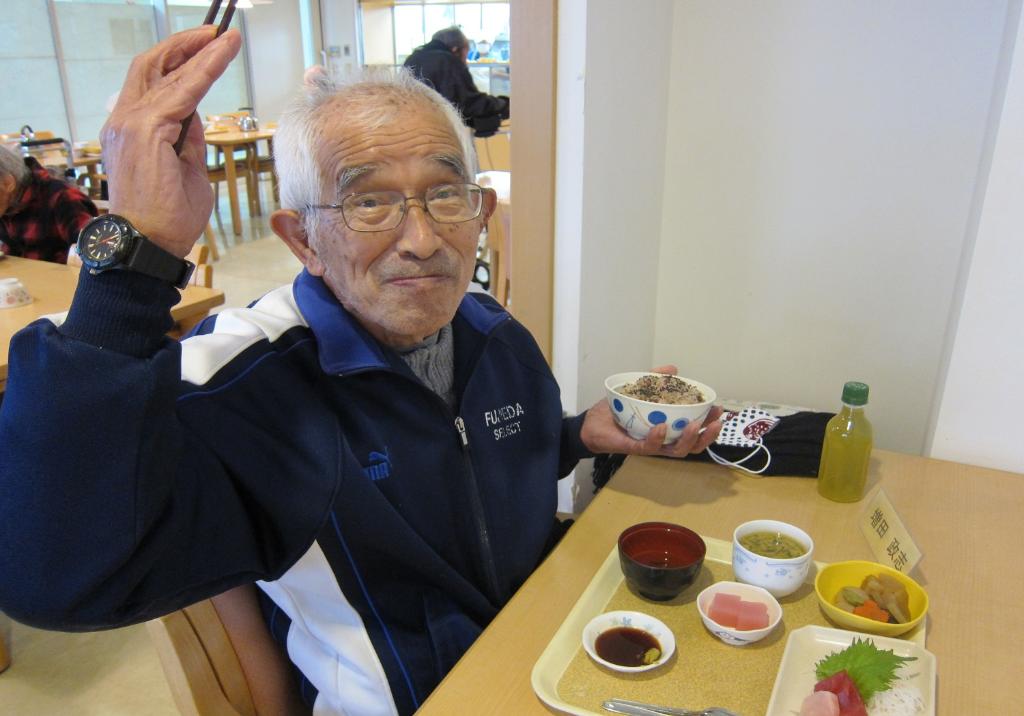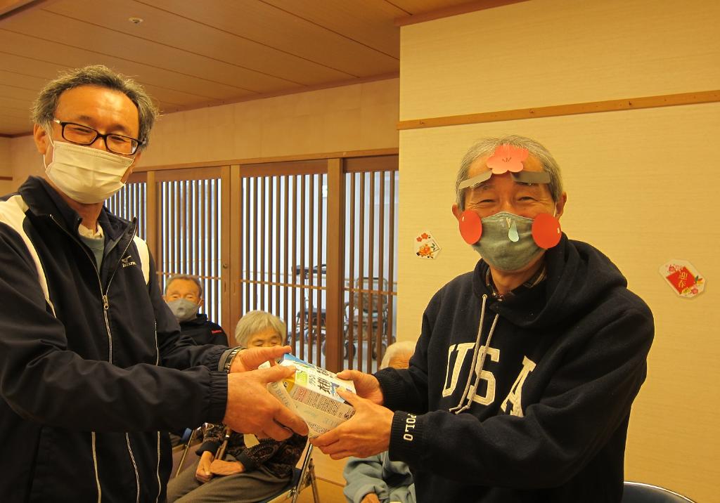 お正月らしく風船羽子板と手作りおみくじで盛りあがりました。洗濯洗剤のお年玉プレゼントには「毎日使うものだから本当に助かるわ」と大変喜ばれました。昼食は赤飯や刺身、茶碗むしなど利用者様に人気のあるメニューが彩りよく並びました。「これならもう一杯食べられるよ」等と、皆さん大満足されていました。