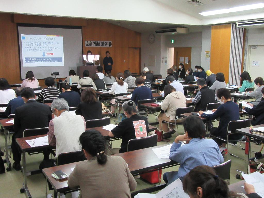 参加者からは「ヤングケアラーの実態について改めて理解することができた」「高齢者だけでなく、子どもの見守りも行っていきたい」「子どもの小さな変化に気づき声かけができるようになりたい」などといった意見が多く聞かれ、児童福祉の啓発につながる講演会を開催することができました。