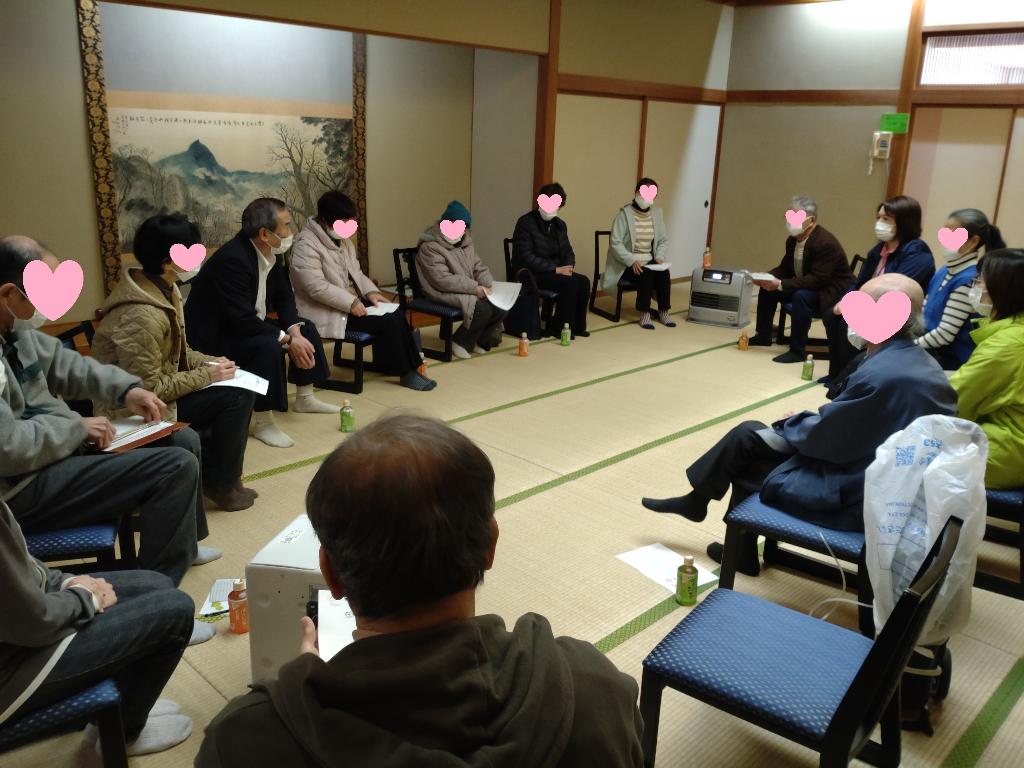 ふだん、ご家族の介護をしながら思っていること、悩んでいることを、互いに話し合い、最後まで話が尽きませんでした。参加者の皆さんから「参加してよかった」というお声をたくさんいただきました。今回は『認知症カフェ』について町内保健師より話があり、皆さんの意見を伺うこともできました。