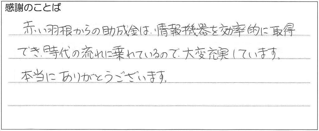 赤い羽根からの助成金は、情報機器を効率的に取得でき、時代の流れに乗れているので大変充実しています。