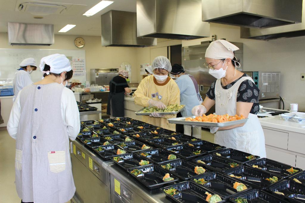 ひとり暮らし・二人暮らし高齢者世帯等で申込まれた方に対し、旬の食材を使い栄養のことも考えた弁当を調理ボランティアが社協の栄養士とともに調理する。そして見守り・安否確認を兼ねて配食ボランティアが自宅まで配食する。