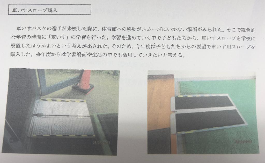禾生第一小学校では、みんなで力を合わせてボランティア活動を行ってきました。困っている人に少しでも役に立ちたいと思って続けてきました。その活動に対して寄付をいただき、心から嬉しく思っています。車椅子で来校される人たちが安心できるように、車椅子用スロープを購入させていただきました。ありがとうございました。これからもボランティア活動を全校で進めていきます。