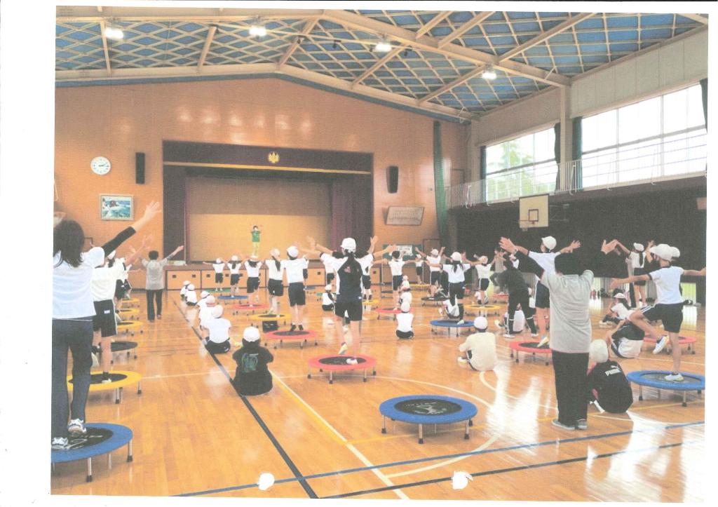 小学校体育館にてトランポロビックス運動を実施しました。兵庫県トランポロビックス協会の講師2人をお迎えし、リズム体操をミニトランポを使って体験しました。体幹づくり、バランス感覚のUP,集中力のUP!リズミカルな有酸素運動でみんな元気・笑顔・音楽に合わせて楽しい時間を過ごしました。ご支援ありがとうございました。児童たちは大興奮でした。