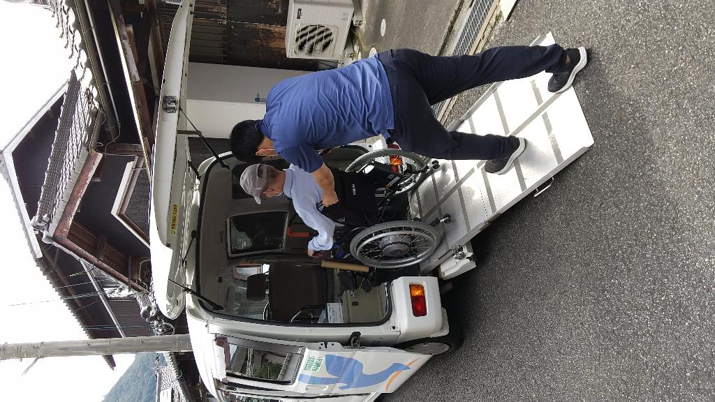 身体機能が著しく低下し、普通乗用車に乗れない方を対象に、スロープ付きの福祉車輌を使って、車いすに乗ったまま自宅から病院までの送迎サービスを行う。