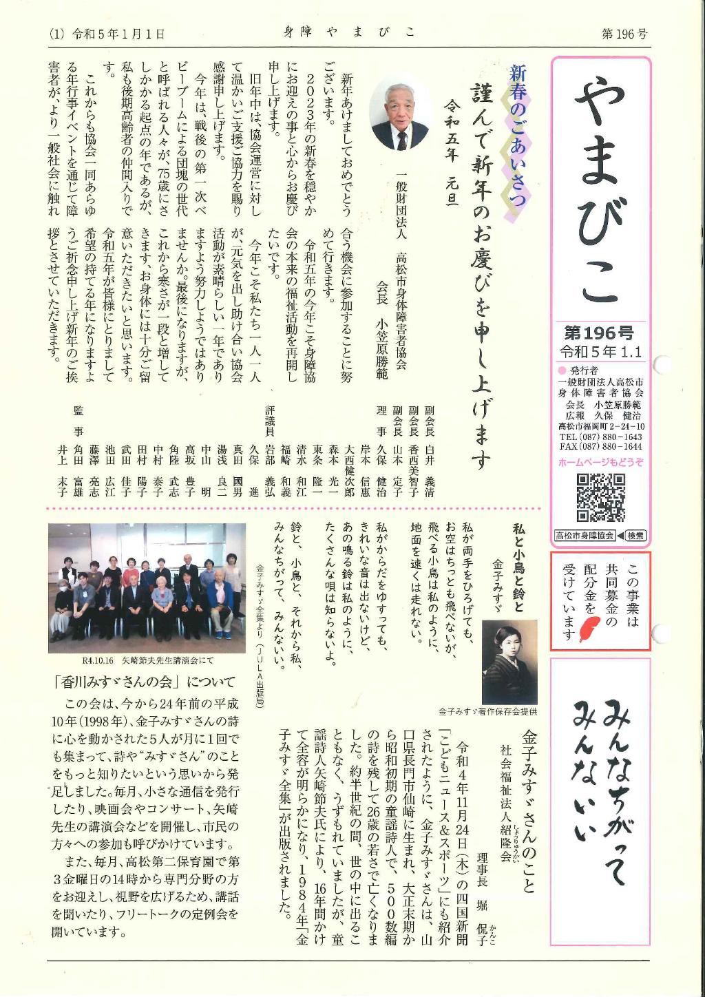 6月にコロナ禍により3年ぶりにようやく開催された高松市身体障害者福祉大会に参加し、久しぶりに会員との交流が出来ました。式典後のアトラクションも楽しませてもらい元気が湧きました。また11月に開催された高松市身体障害者文化祭では、文化祭を通じて会員相互が久しぶりに談笑する姿や来場する方々と接する姿も多く見受けられ、障害者が一般社会と触れ合える機会の一助になりました。