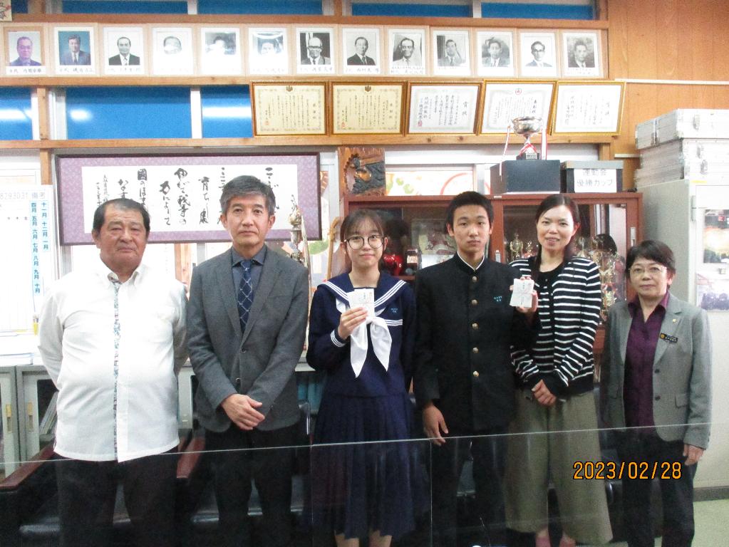中学を卒業して島を離れる卒業生に図書カードを贈呈して、島の思いと、これからも勉学に励んでもらうことを期待して行います。併せて、街頭募金や学校募金への協力へ感謝を表します。