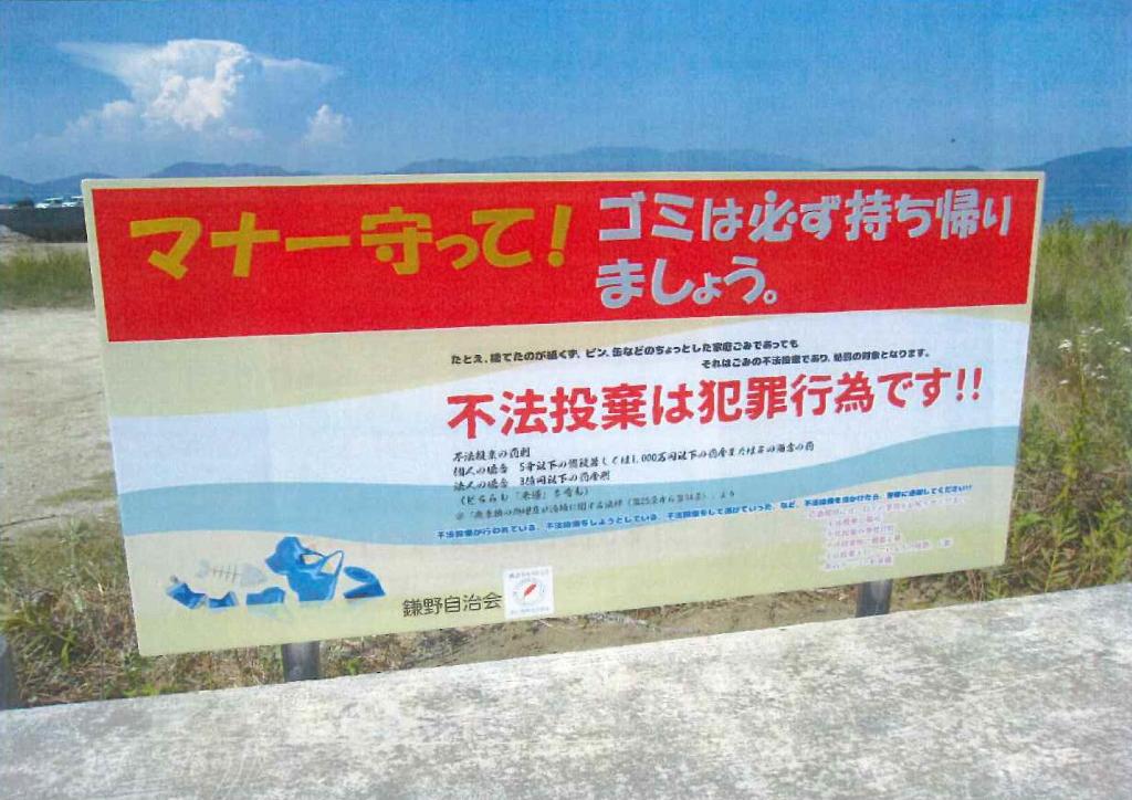 海水浴場には多くの方が来られますが、中にはゴミを放置する人も増え自治会としては大変困っておりました。今回、ゴミ持ち帰りの看板を設置して頂きました。また、このほか子どもたちが縄跳び練習のために使用するジャンピングボードなど購入いただきありがとうございました。有効に活用させていただきます。