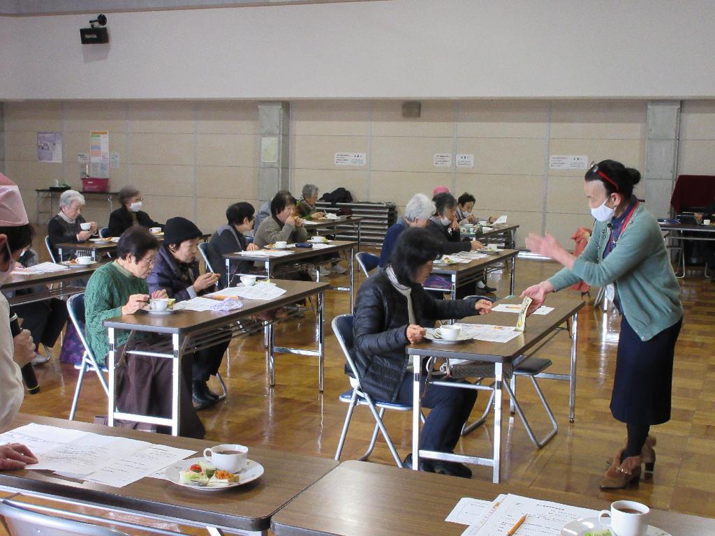 新型コロナウイルスの感染拡大防止のため、参加者全員での料理は中止となりました。地域のヘルスメイトさんが準備された料理を試食し、栄養士さんによる「血液サラサラに!」と言うテーマで玉ねぎの効能や栄養についてお話をいただきました。来年度こそは、参加者皆さんでの料理教室を再開できたらと思います。