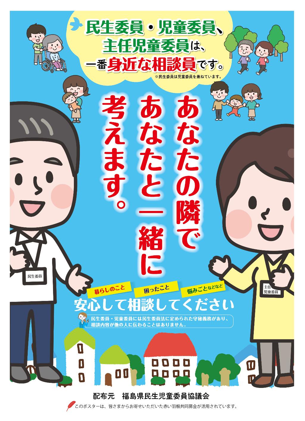 今年度は3年に一度の一斉改選の年にあたり、約1,700名の民生委員等が交代しました。つきましては、共同募金の配分金により、「広報・啓発ポスター」を作成し、小中高校や社協・行政等の公共機関で、誰の目にも触れ、関心を持ってもらえるように配布させていただきました。