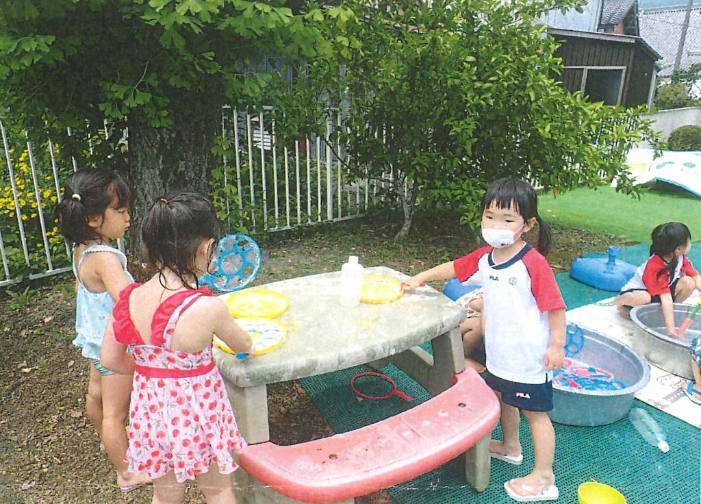 園児や子育て広場の親子での参加者も、シャボン玉あそびに夢中になり、夏の楽しいひとときを過ごしました。