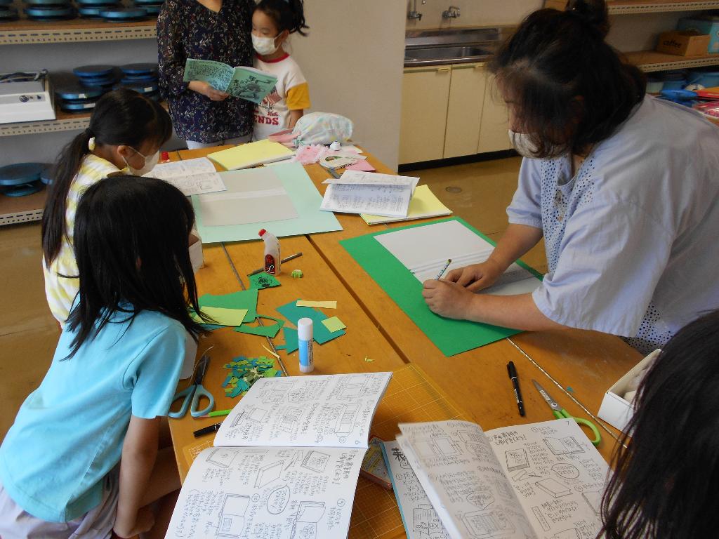 小学校夏休み期間中に開催し、子どもたちが折り紙を切って貼ったり、自由に絵を描いたりして、世界にひとつだけの絵本を作るものです。