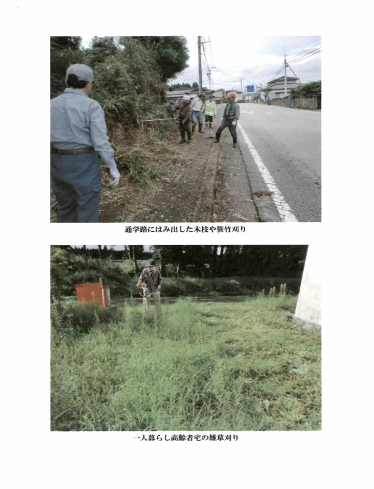 一人暮らし、高齢者世帯、空屋等で敷地内や周辺の管理ができない所の草刈り。防犯灯やカーブミラー周辺の枝落とし。苗木植樹。