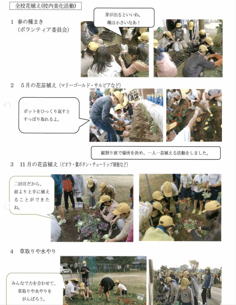 ボランティア委員会の児童達は、ポットに種まき、草取り等の活動をし、自分たちの学校を自分たちの力を合わせて美しくしようとする心情を高めることができました。