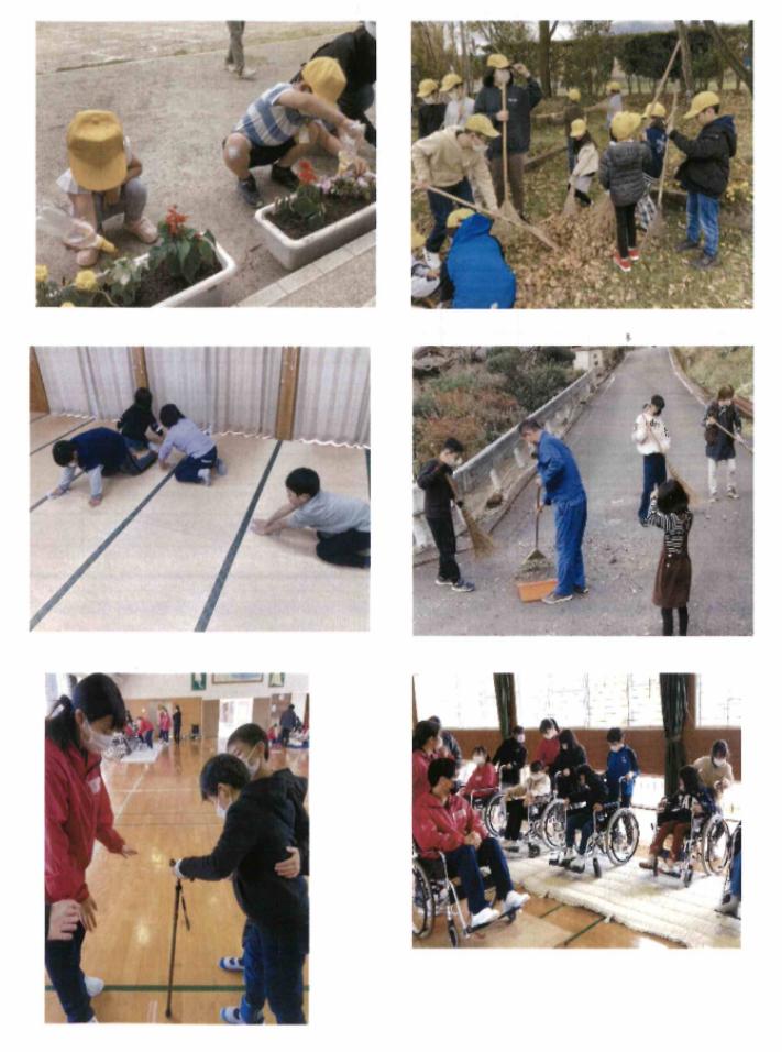 本校では、全校児童で一人一鉢の「花いっぱい活動」で花を植えたり、地域の清掃ボランティア活動を行ったりしました。活動を通して美しい環境を作ろうとする態度や地域の一員として地域をよりよくしていこうとする態度を育てています。また、高齢者や障がい者への理解を深めるために、阿蘇市社会福祉協議会並びに阿蘇中央高校福祉課との交流を行い、福祉への理解を深めました。