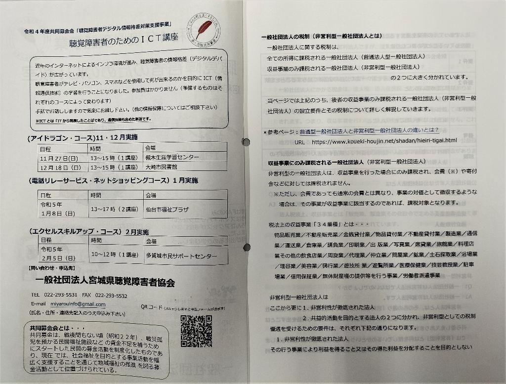 コロナ禍の最中に社会の移り変わりが激しくなり、デジタルによる生活の変化が浸透してきました。研修や会議はオンライン形式が増え、使いこなせない聴覚障害者がいます。助成金を活用し研修会をおkないました。「どう使えばいいのか学ぶことができいい機会になりました。」と次年度も継続してほしいという声もあり、今後も続けて行きたいと考えます。ご支援本当にありがとうございました。