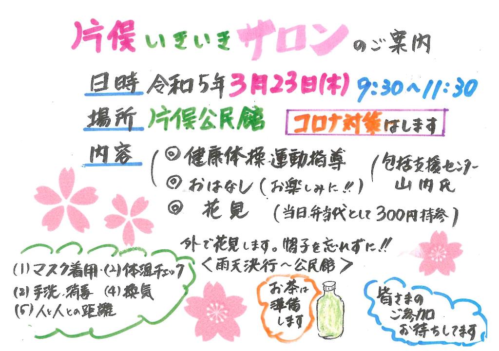 写真は片俣地区で行っている「片俣いきいきサロン」の案内状とサロン活動の様子です。
