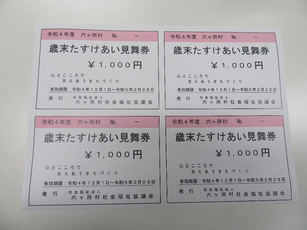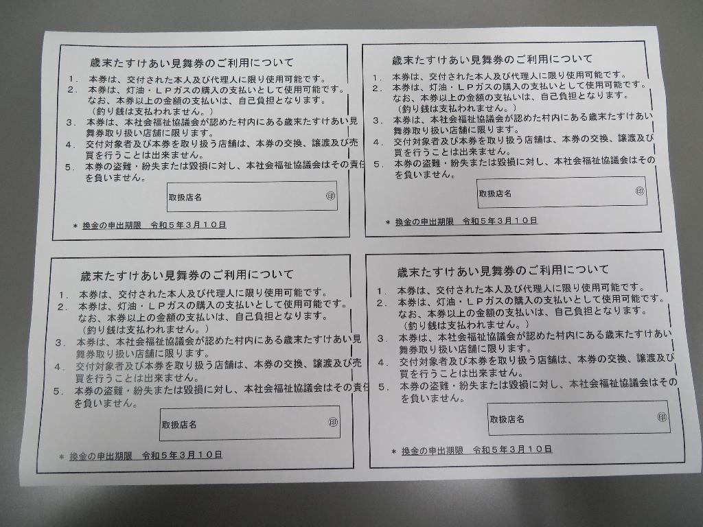 民生委員のご協力のもとに、70歳以上の一人暮らしの高齢者、75歳以上の高齢者のみ世帯を対象に、額面3,000円分の灯油・ガス引換見舞券を配付することができました。