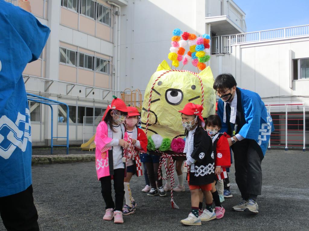 土台を作り、色付けまで自分たちで取り組んだ手作りの神輿はどれも人気で、特に年長児の「すみっこぐらし」のキャラクターのねこ神輿は、子供たちの注目を集めました。ありがとうございました。
