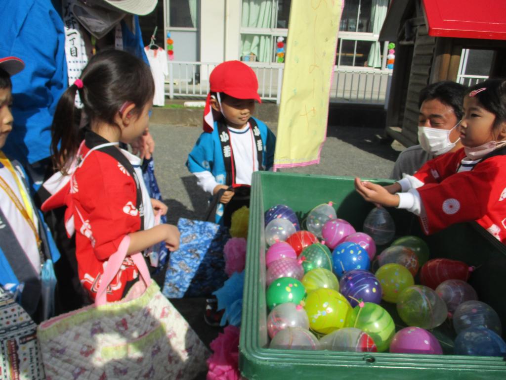 11月17日、楽しみにしていた「なかよしまつり」が開催されました。金岡保育所の友達をお迎えし、マスクをつけたり、消毒をしたり、人との間隔をあけたりしながら実施しました。幸い晴天に恵まれ、屋外で手作り神興を担いだり、音頭を踊ったり、お店屋さんごっごをやったりすることができました。